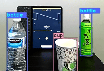 Here is a brief summary of the AI inference when two bottles, one cup and a tablet is placed on a table. Note that the tablet is not labeled in the model used, so the AI inference does not recognize the tablet as an object.